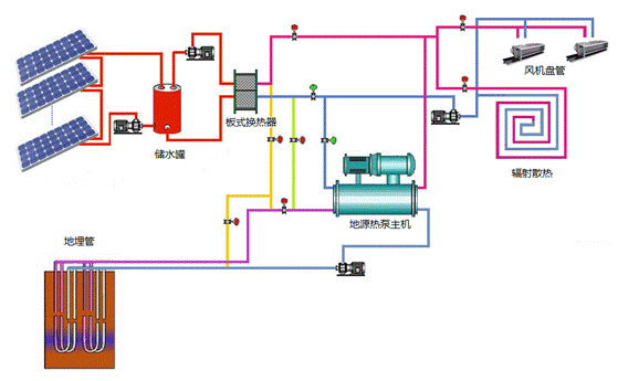 當室外溫度較高(gāo),熱負荷較小的(de)情況下,太陽能蓄熱溫度滿足供熱需要,可采用(yòng)太陽能直接供熱,否則作為(wèi)地(dì)源熱泵系統輔助熱源。示意圖如下: